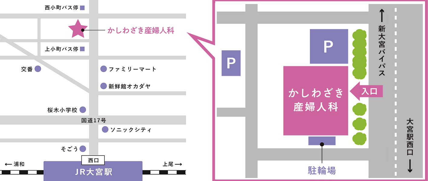 - JR「大宮駅」西口より西武バスに乗車、「上小町」下車で徒歩1分、「南上小町」下車で徒歩4分、「桜木四丁目」下車で徒歩4分
